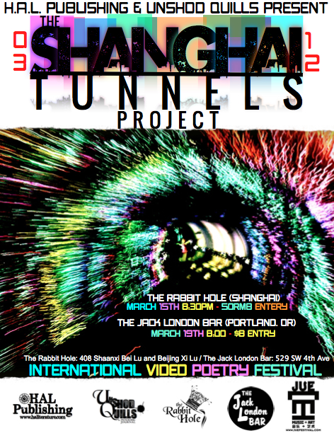 In 2012, HAL Publishing of Shanghai, China and its sister site, Unshod Quills of Portland, Oregon, teamed up with Monica Storss of Portland, Oregon and China’s JUE Arts and Music Festival to produce the first known China-US based video poetry festival. Submissions were sought and sent from all over the world. A panel of four officers with the Shanghai Tunnels Project prescreened the videos, selecting those for judging that most met their definition of video poetry. The original call for submissions, along with the rules and regulations,  can be found here, on Unshod Quills, and at HAL Publishing.